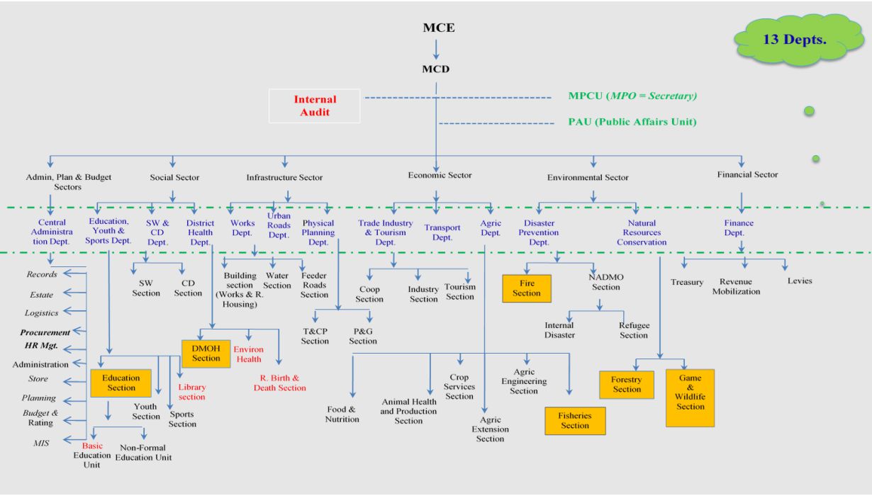 As already mentioned, the Municipal Chief Executive (MCE) is supported by a Secretariat or Central Administration referred to as the Office of the Municipal Assembly which is headed by a Municipal Co-ordinating Director (MCD) who reports to the MCE and is in charge of the day – to – day administration of the Assembly. The Municipal Co-ordinating Director(MCD) is also in charge of all Heads of Decentralized Departments of the Assembly. This reporting relationship gives the office of the Municipal Assembly a core secretariat or central administration vis- a – Vis service delivery or decentralized dichotomy